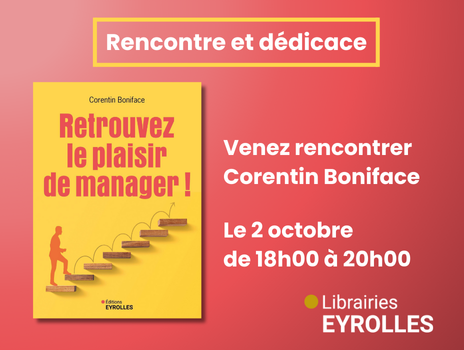 La soirée de lancement et de dédicaces de Corentin Boniface pour son livre Retrouvez le plaisir de manager ! aura lieu le jeudi 2 octobre, de 18h00 à 20h00, à la Librairie Eyrolles (55 boulevard Saint-Germain, Paris 5e).