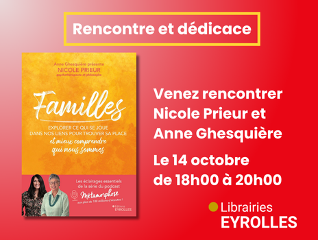 La soirée de lancement et de dédicaces de Nicole Prieur et Anne Ghesquière, pour leur livre Familles, aura lieu le mardi 14 octobre, de 18h00 à 20h00, à la Librairie Eyrolles (57 boulevard Saint-Germain, Paris 5e).