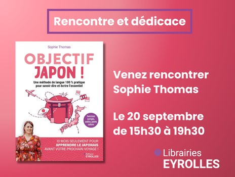 La soirée de lancement et de dédicaces de Sophie Thomas pour son livre Objectif Japon ! aura lieu le samedi 20 septembre à la Librairie Eyrolles (55 boulevard Saint-Germain, Paris 5e). Dès 15h30, vous pourrez assister à une présentation et une initiation autour de l’ouvrage, avant de retrouver l’autrice pour une séance de dédicaces et un moment d’échange convivial autour d’un cocktail, de 16h30 à 19h30.